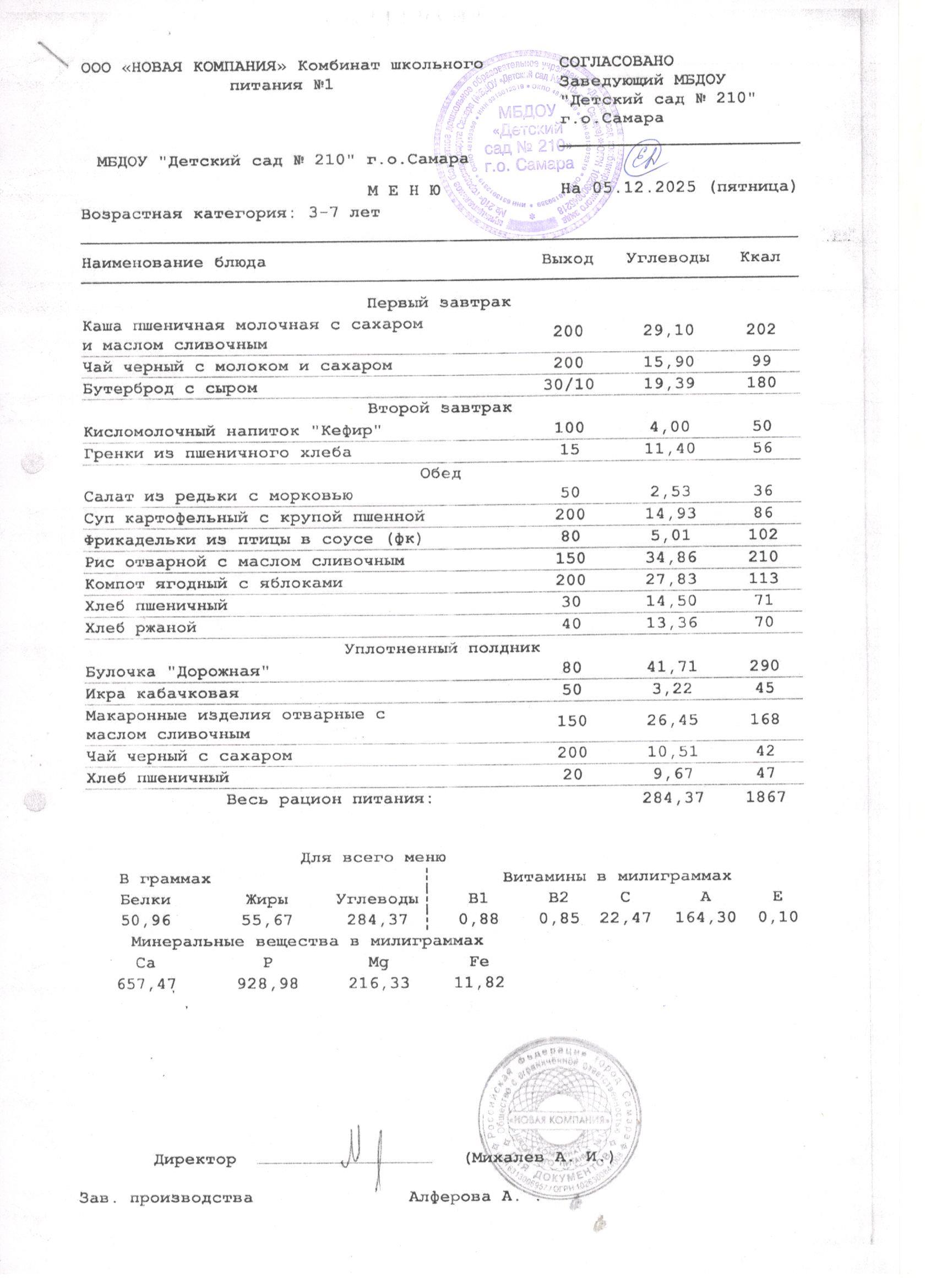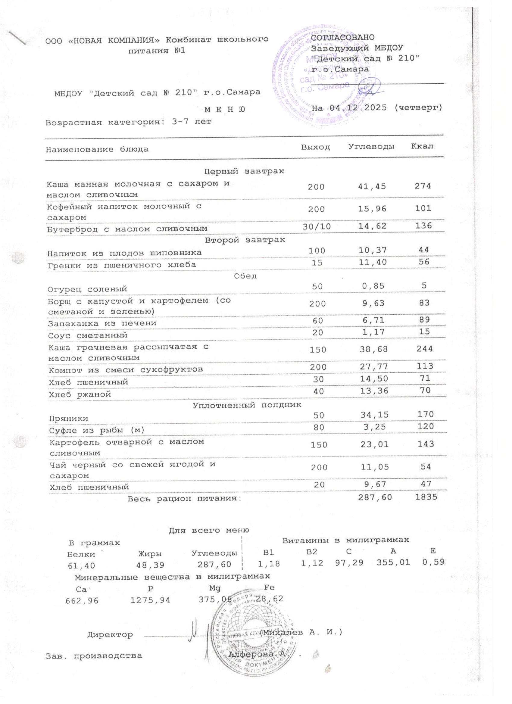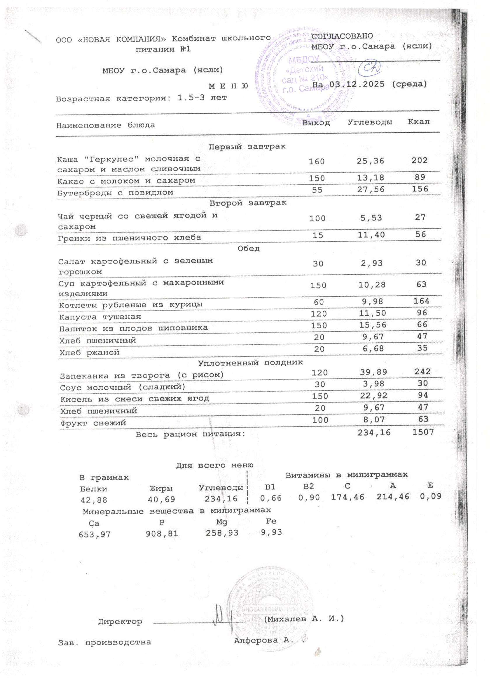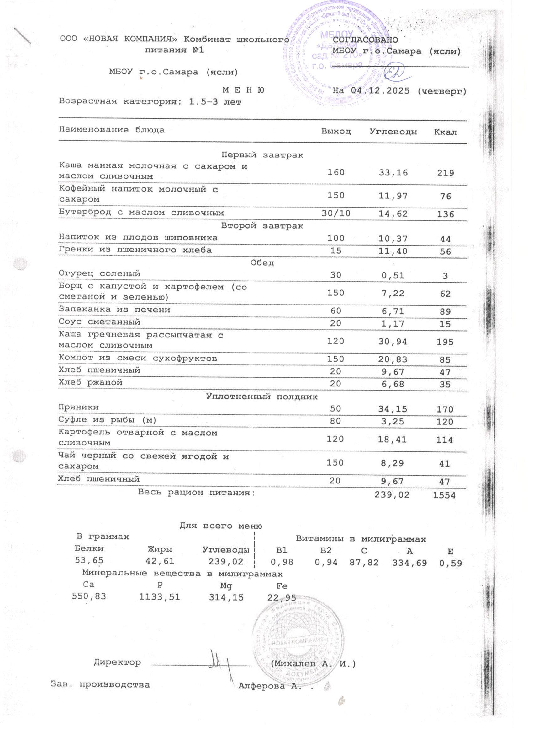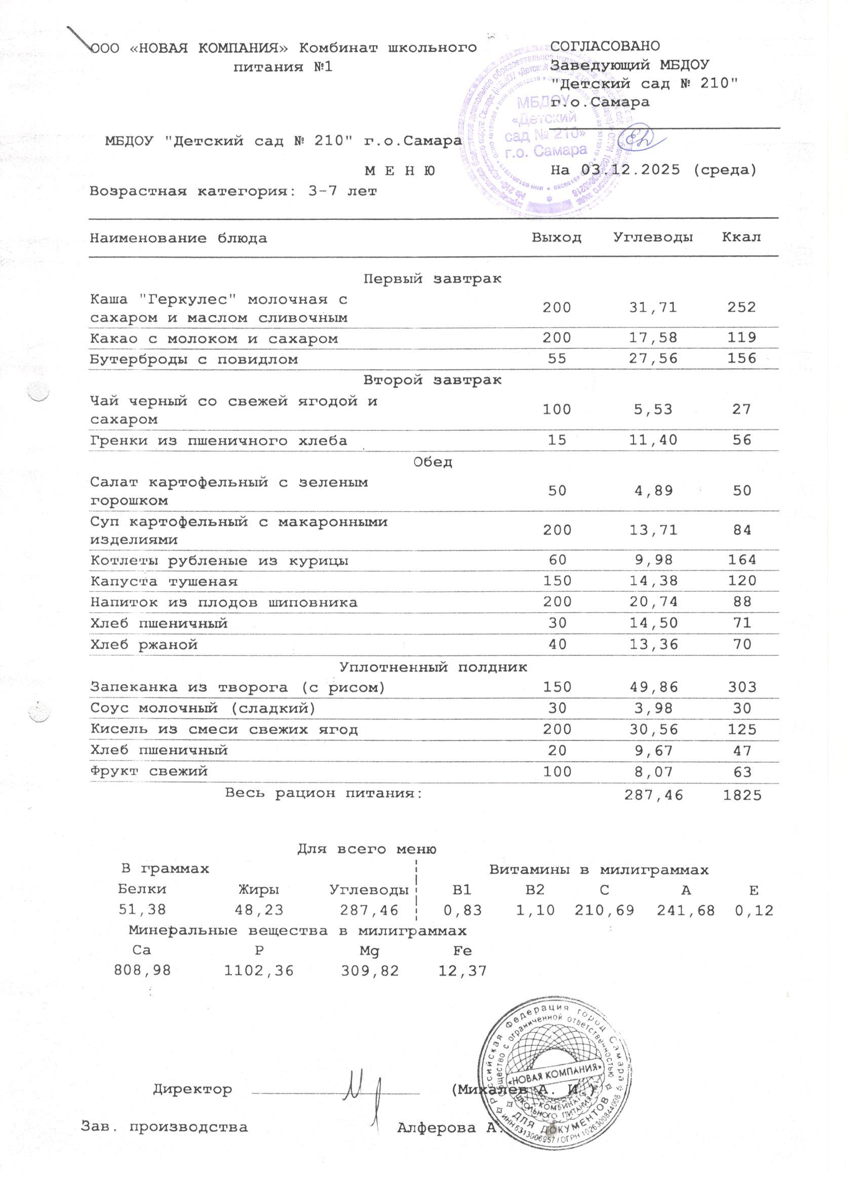 Организатором питания для воспитанников МБДОУ «Детский сад № 210» г. о. Самара является ООО «НОВАЯ КОМПАНИЯ «Комбинат школьного питания №1».