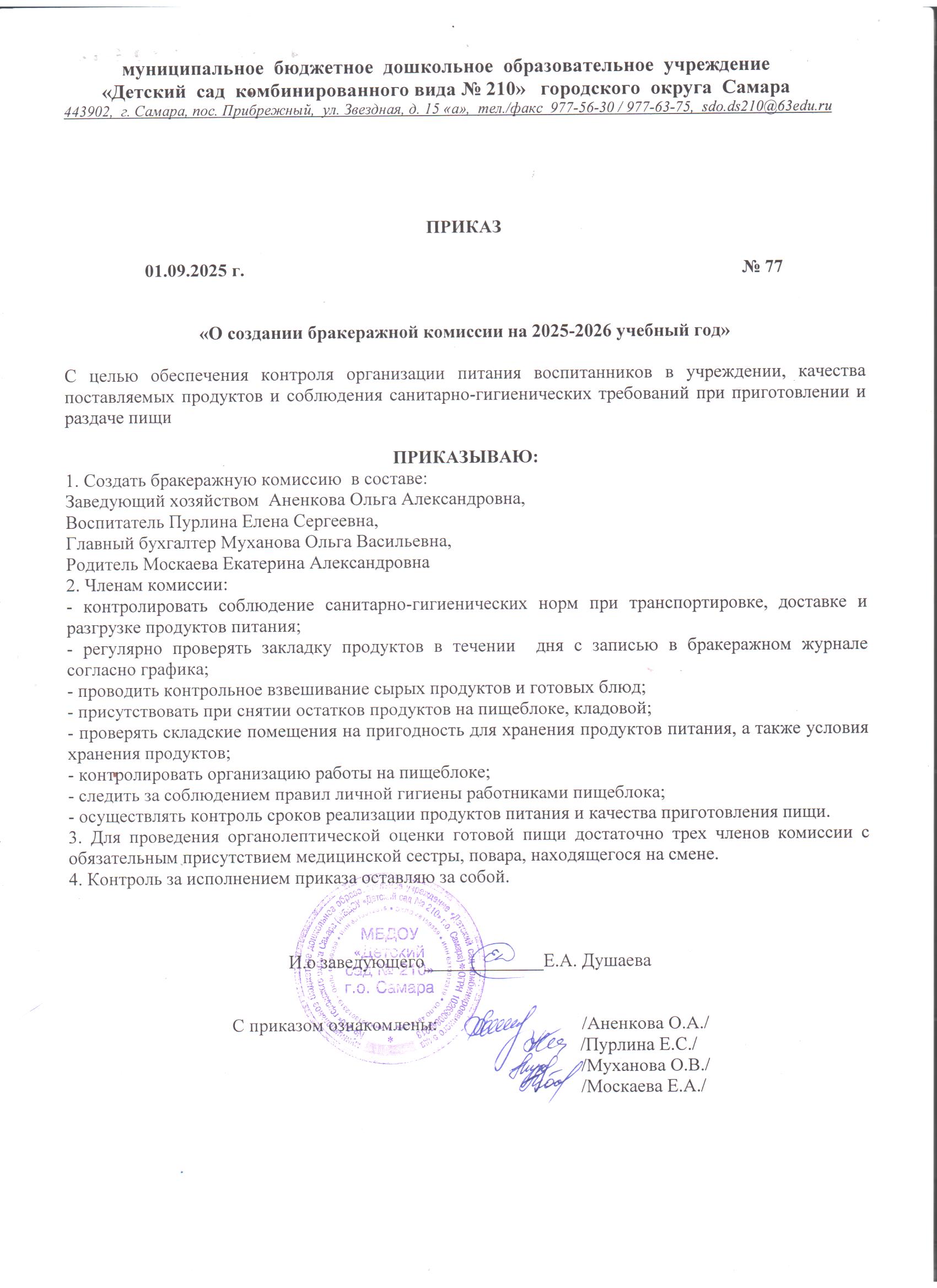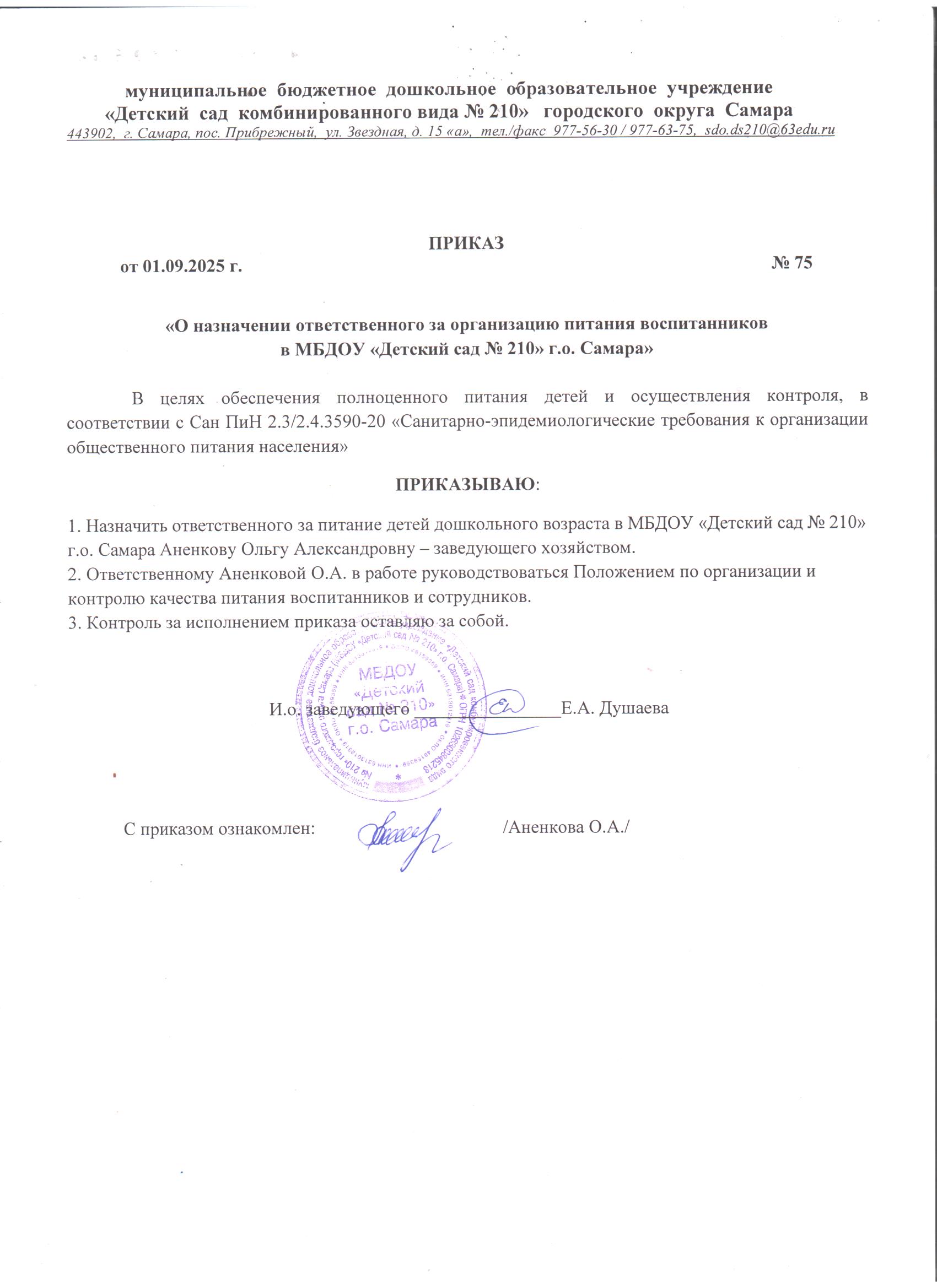 Ответственным за организацию питания в МБДОУ «Детский сад № 210» г. о. Самара является заведующий хозяйством Аненкова Ольга Александровна, тел 8-846-977-56-30,